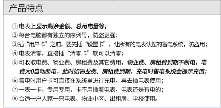 主要特點(diǎn):應(yīng)用計(jì)算機(jī)管理,先購(gòu)電后用電;在額定電流范圍內(nèi)能限制使用功率(由供電部門(mén)限定);一表一卡,專(zhuān)卡專(zhuān)用,失卡不失電,補(bǔ)卡再用;電卡能雙向傳遞數(shù)據(jù),能自動(dòng)斷電告警用戶購(gòu)電;電量為零時(shí),自動(dòng)拉閘斷電;并具有一定的防竊電軟件設(shè)計(jì)等。
